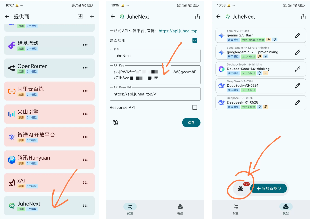 2、注意:RikkaHub 对原生格式的支持非常到位,所以我们在使用 JuheNext 的时候,默认采用 OpenAI 兼容传统 chat 格式对接,但是如果想要更完整的模型体验,例如需要开启 Gemini 或Claude 的思维链,则建议通过 Gemini 原生接口/Anthropic 原生接口添加。原生接口下模型获取不到,需要手动填写一下。