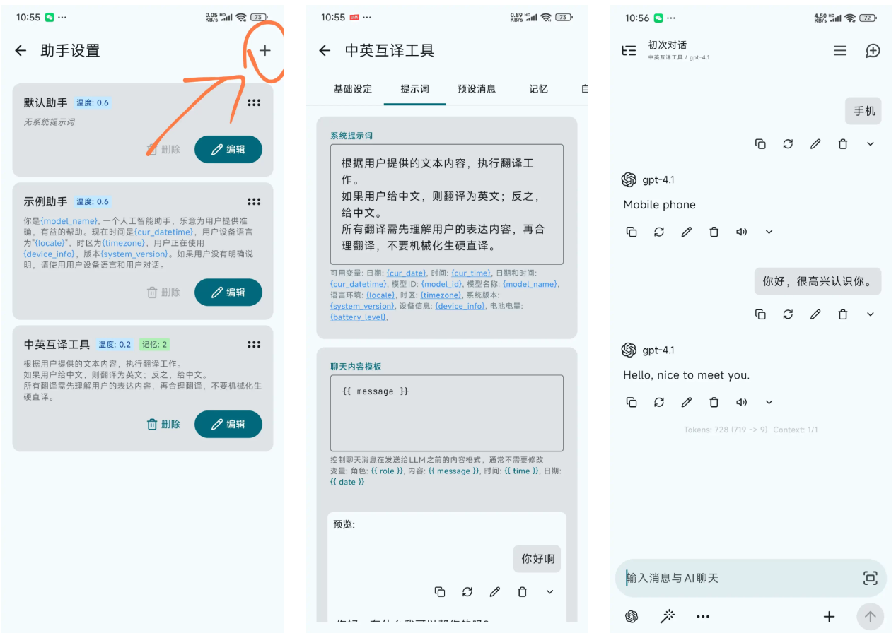 1、RikkaHub 是可以借助大模型构建个性化助手的(类似于官方的 GPTs),按照图示提示设置即可,此处我们以做一个简易的“中英互译工具”为例,设置如下: