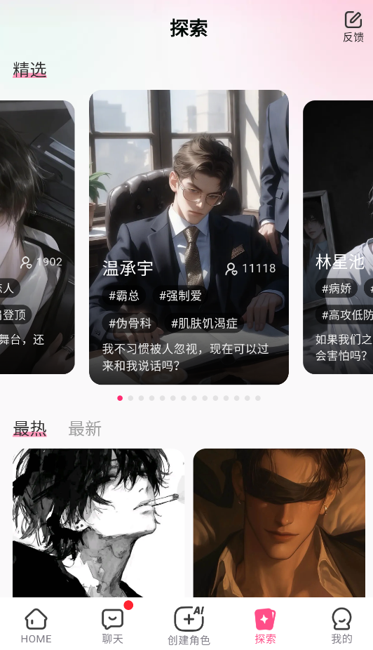 1、下载安装并打开软件后,首先在探索页面中选择一个感兴趣的角色。