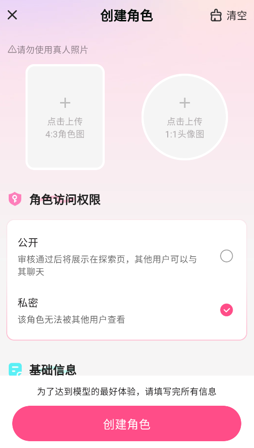 2、进入创建页面后,点击上传角色图片,头像、是否公开。