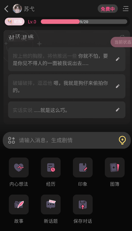 4、进入聊天界面后就可以与其进行对话了,可以自行输入内容,或者点击对话灵感。