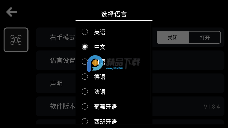 2、进入软件后,点右侧是设置,使用指引,图片视频查看和开始操作无人机。