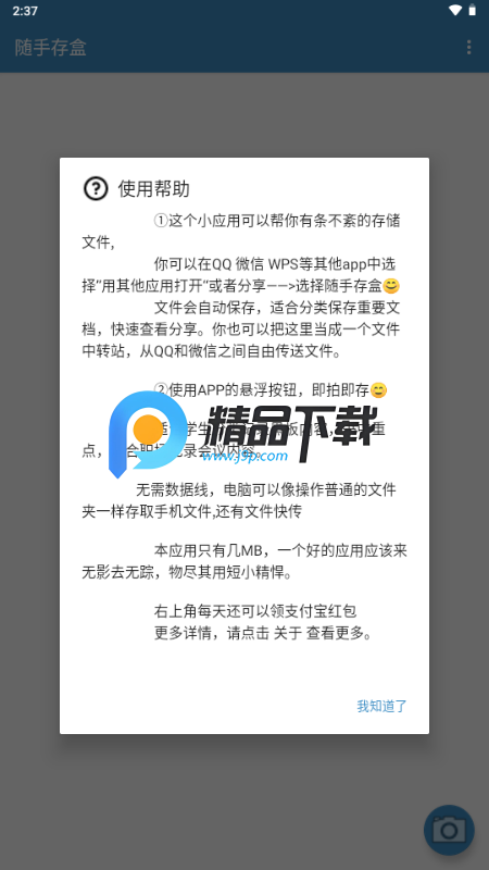 ①这个小应用可以帮你有条不紊的存储你可以在QQ 微信 WPS等其他app中选择”用其他应用打开“或者分享-->选择随手存盒文件会自动保存,适合分类保存重要文档,快速查看分享。你也可以把这里当成一个文件中转站,从QQ和微信之间自由传送文件。