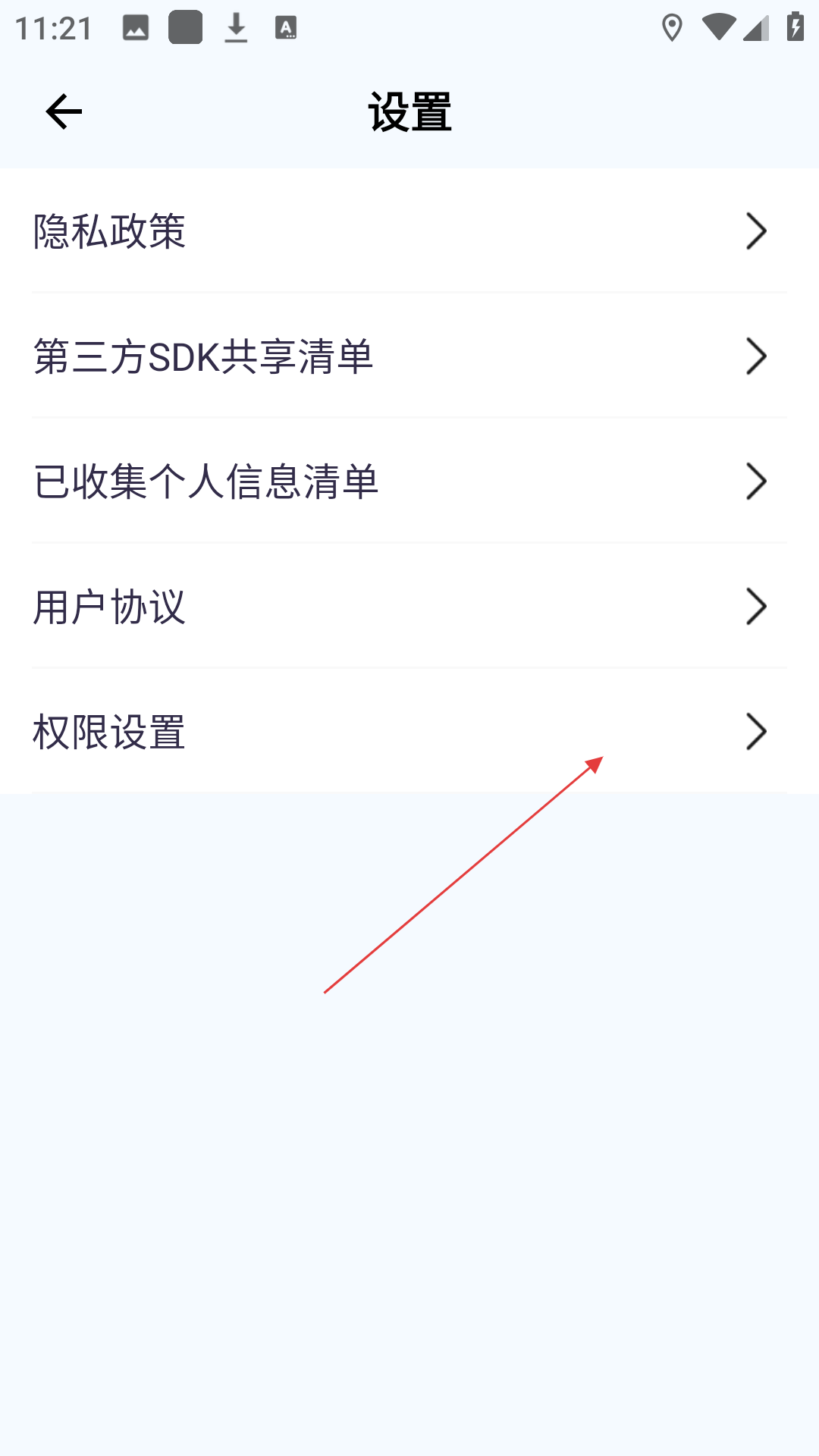3、在设置页面点击【权限设置】选项进入权限设置页面。