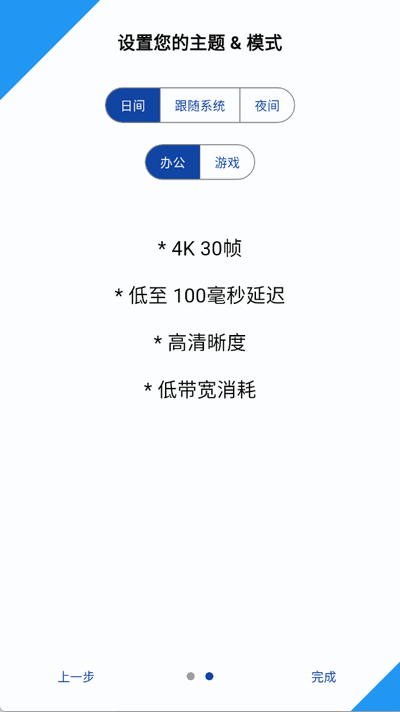 1、打开云玩加软件进入主页,点击右下角“完成”,设置主题和模式以及分辨率、帧率等参数后进入登录界面。