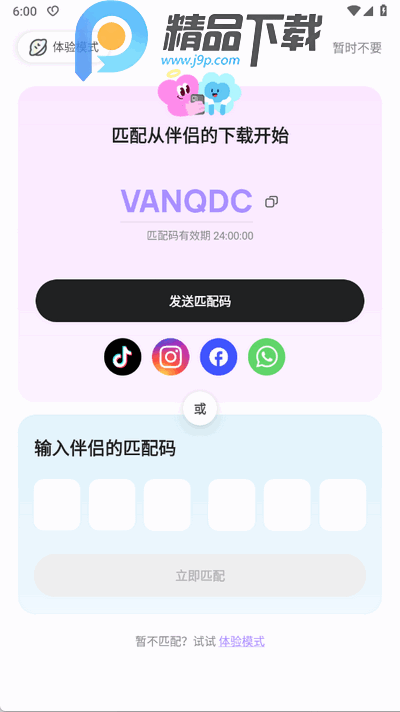 2、输入匹配码或者发送匹配码进行绑定情侣