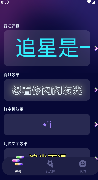 1、在弹幕页面中包括普通弹幕、霓虹效果、打字机效果和切换文字效果等;