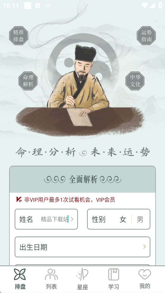 安卓手机上一款可以免费自测排盘的工具,排盘app手机免费版,功能丰富,快速排盘测八字,还包含了星座运势,国学类书籍学习,详细的排盘解析,提供方便快捷的信息内容,操作方便,更便捷的了解国学排盘相关内容。