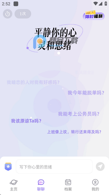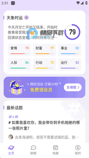 界面非常美观的一款星座治愈类话题社交聊天交友平台,心屿app又名心屿星座软件,轻松测试爱情,运势,财富,事业,生活,为你解决各种疑惑,支持透过天象了解未来,多维度解读星座,丰富且专业的回复,全面剖析星盘能量物质,操作简洁方便。