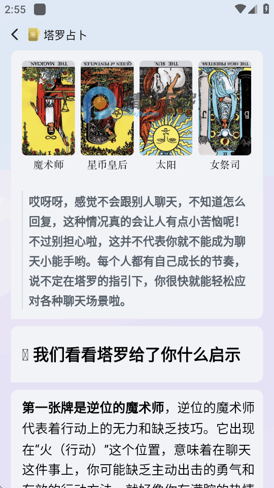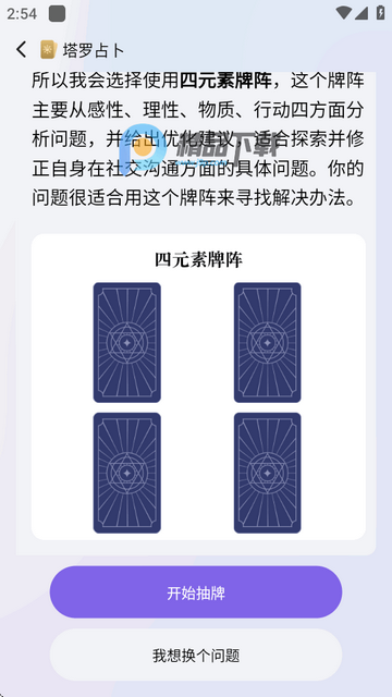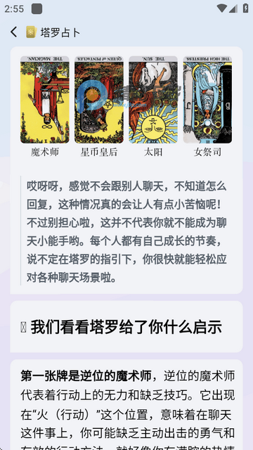 3、包含两大核心体验 —— 保留 “传统塔罗仪式感”(牌面视觉呈现、抽牌流程设计贴合传统流程),同时搭载 AI 解读系统,快速生成牌面含义分析,并支持基于解读结果的深度沟通(如追问 “如何应对牌面提示的挑战”)。