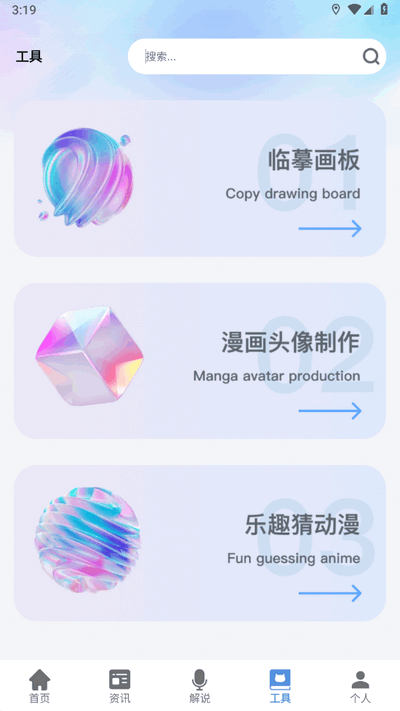 4、在工具中提供了临摹画板、漫画头像制作以及乐趣猜动漫三大功能,可以满足不同功能的特色。