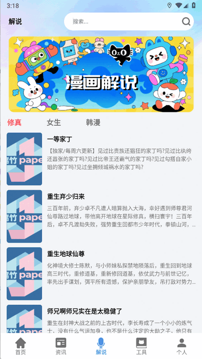 3、在解说页面中提供了修真、女生以及韩漫三大分类的漫画解说内容,及时了解最精彩的漫画解说信息;
