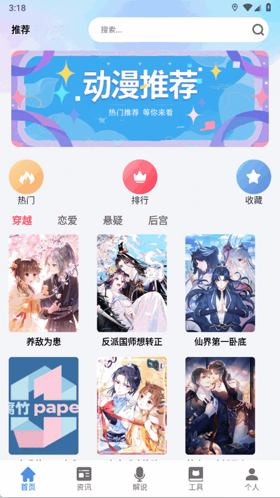 1、在首页中提供了热门、排行以及收藏等版块,同时可阅读穿越、恋爱、悬疑以及后宫四大类型的漫画简介;