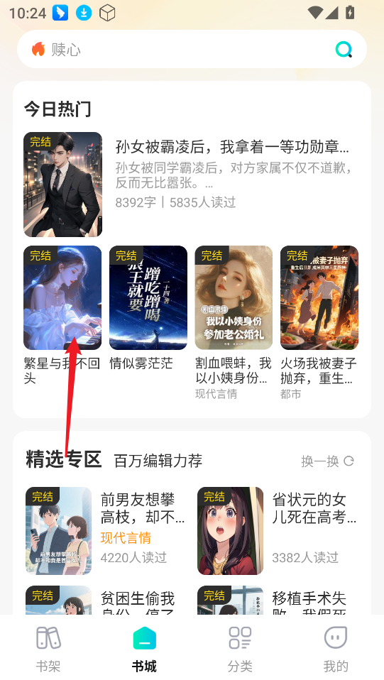 2、进入书城页面可根据热门、精选和新书等推荐页面选择小说,也可直接搜索。
