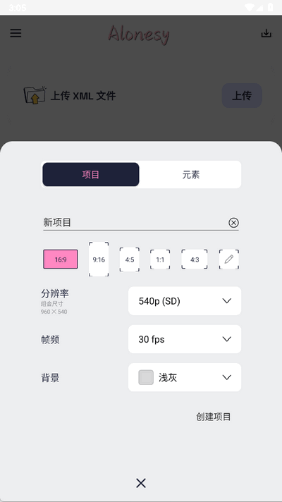 3、设置新项目大小,分辨率,帧频,背景等等,点击创建新项目