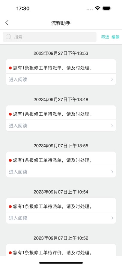 2、工单系统:从报修申请到完工验收全流程电子化流转,提升处理效率;工单列表界面清晰区分待办与进行中状态,支持分页操作。