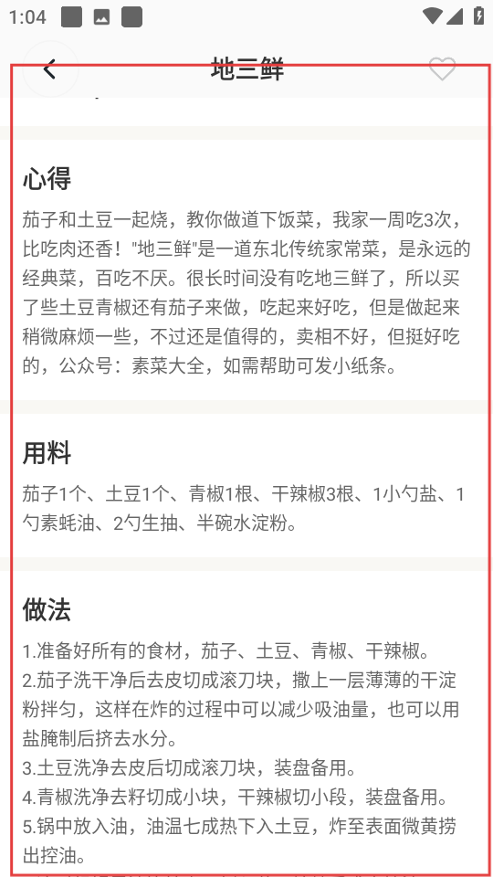 3、进入菜品详情页,即可查看菜品的心得,用料和做法。