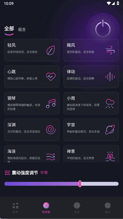 1、预设模式丰富:内置多种精心设计的振动方案,包括“轻风”“心跳”“律动”“深渊”“飓风”“海浪”“禅意”“火山”“活力”等,每种模式对应