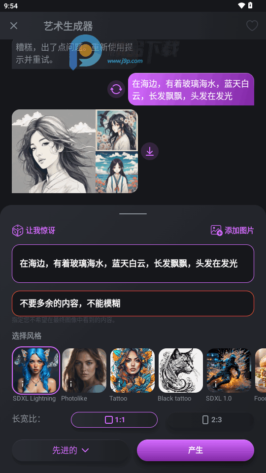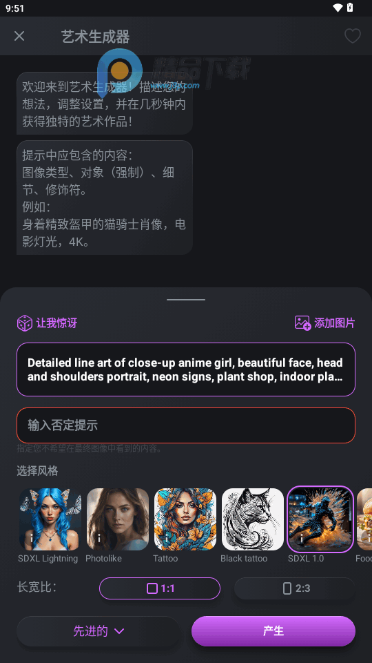 3、进入对话页面,输入提示,可以添加图片制作,选择风格,然后点产生。