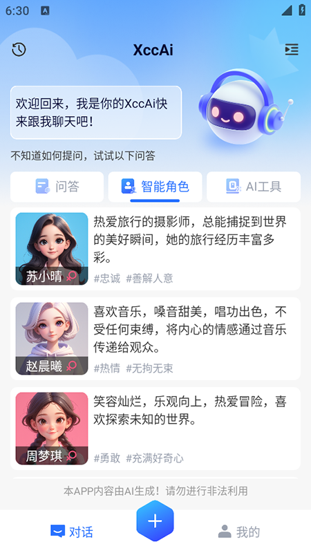 2、想体验角色对话,在首页的智能角色板块选择合适角色进行交流。