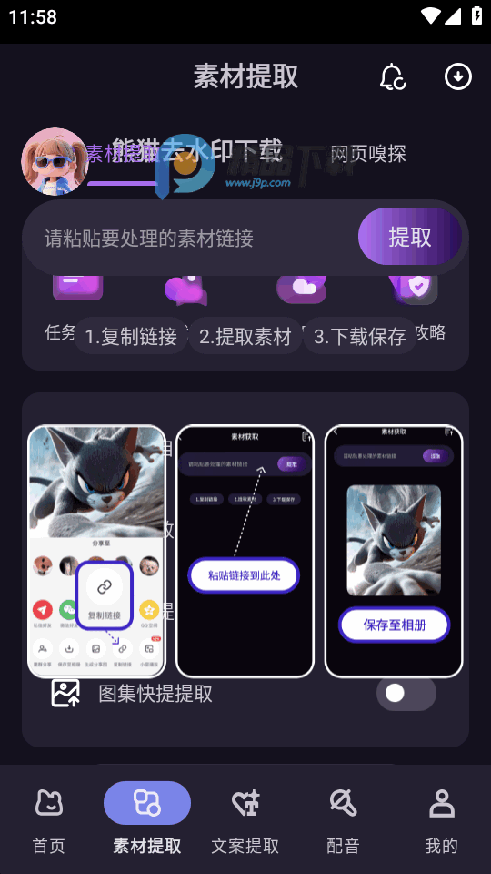 操作也特别简单,只需三步:复制素材链接、粘贴到 “素材提取” 栏点击提取、完成后直接保存到手机相册,解析速度快到不用等。