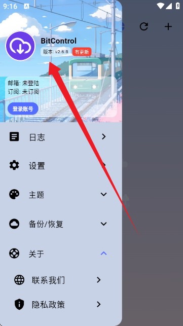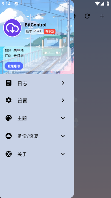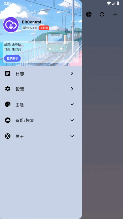 4、然后点击左上角的【三】会弹出如图所示的导航栏,从中可以登录管理账号,查看日志,设置主题以及备份和恢复数据等功能。