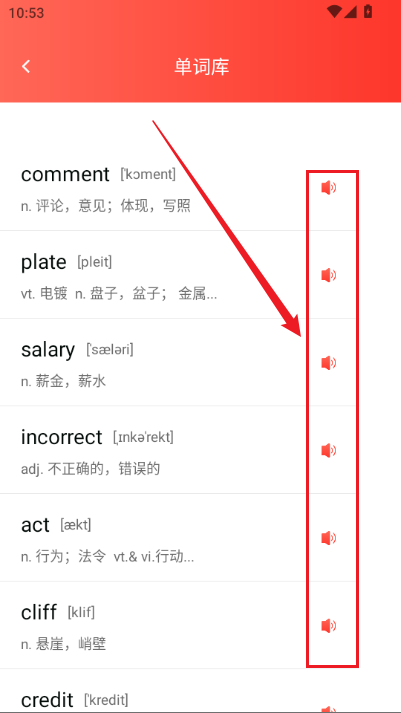 2、点击词库可以看到常见词汇,点击后方喇叭,可以跟着读音学习