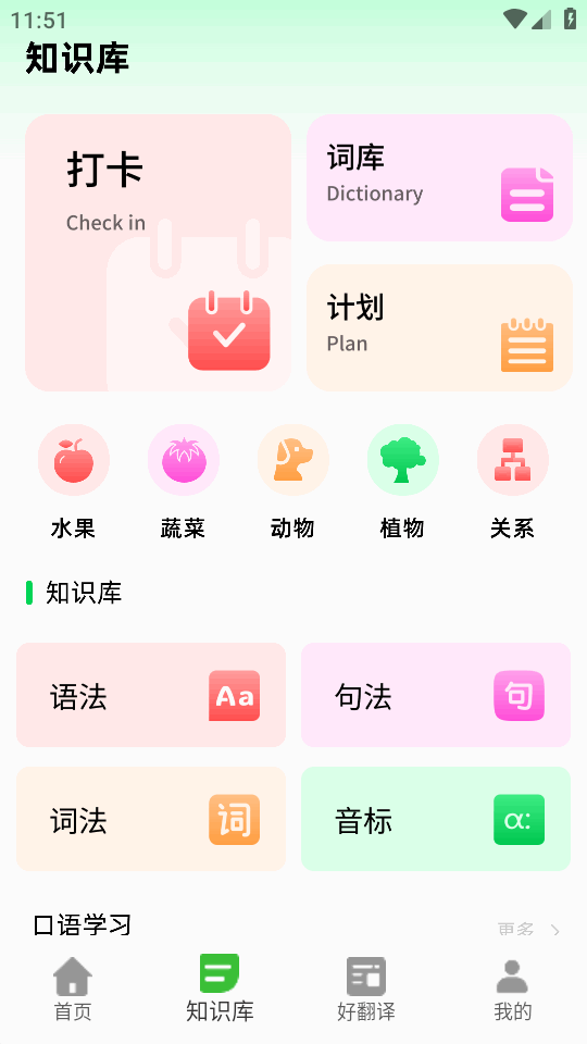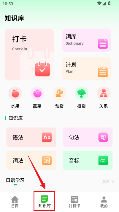 1、进入软件后,点击知识库,可以看到有打卡、词库、计划等功能