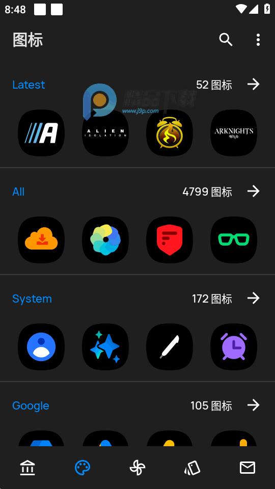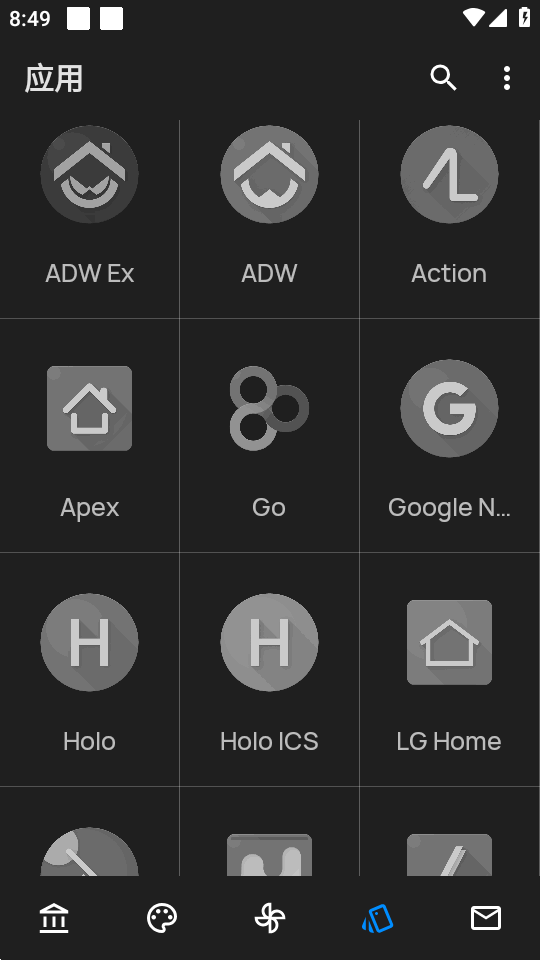 根据应用程序的导航方式类型,你需要从左侧滑调出导航抽屉并前往“应用图标”页面,或者通过点击底部导航栏的第4个图标。在那里你可以选择一个启动器来应用图标包。一些启动器不支持自动应用图标包,因此你需要在那样的启动器设定中手动应用。