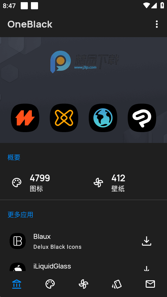 OneBlack是一款谷歌上需要付费才可以下载的图标包软件,精品下载站提供免费的版本给大家,下载后可以免费使用所有的图标及壁纸,高清无水印,没有广告,不需要登录就可以直接使用,很清爽高级大气的图标软件。