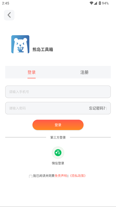 1、下载安装熊岛工具箱手机版,点击“同意并继续”进入界面