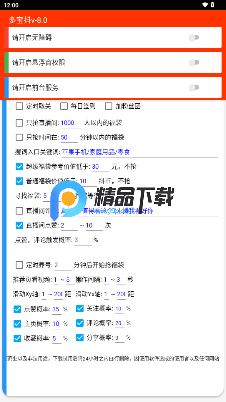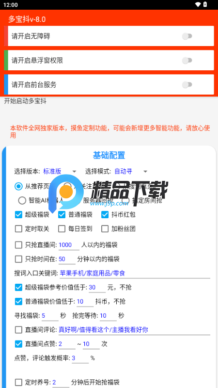 摸鱼福袋助手是一款专为抖音用户设计的抢福袋软件,支持安卓7-12系统,操作简单便捷。该软件能够自动检索直播间中的红包和福袋,并在指定时间内自动开启和秒抢,提高抢到红包和福袋的几率。平时需要抖音抢福袋的软件,可以下载安装。