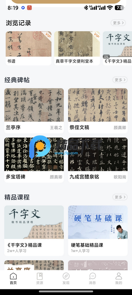 2、进入到软件首页。这里提供了诸多经典碑帖作品,其次上面还提供了拍照识字,以及一些精品课程。