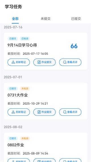 2、点击学习任务,可以随时查看自己任务完成情况,老师点评后能够及时查看点评。