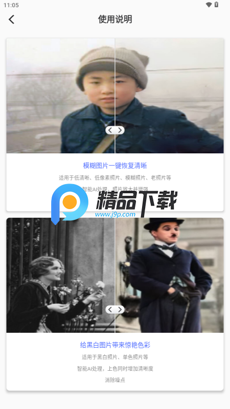 适用于黑白照片、单色照片等智能AI处理,上色同时增加清晰度消除噪点