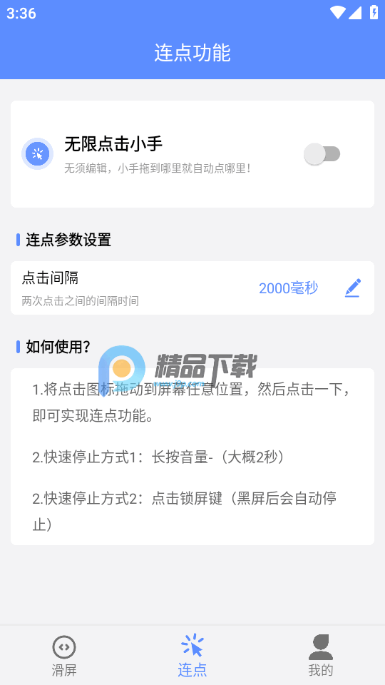 很简洁好用的一款手机快速滑动面板点击器软件,滑屏连点器app可以自定义各种路径、点击时间、滑动次数和速度等设置,轻松易操作,没有广告,不用登录可以直接使用,干净清爽直观的操作,无论新老用户都可快速上手。