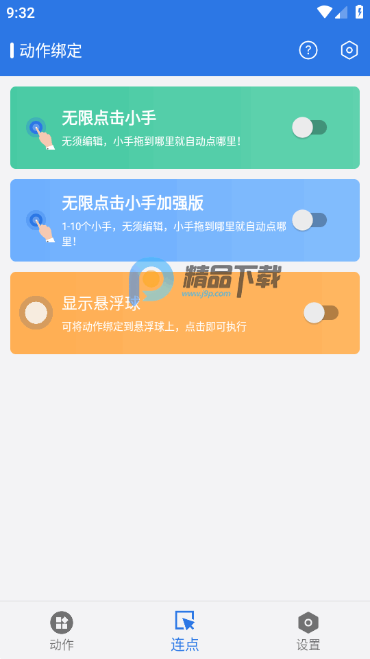 自由度极高的一款手机自动连点助手,自动连点小手app是个免费的版本,进入后不需要vip就可以使用所有的功能,界面中清爽干净直观易用,可以绑定动作,设置无限点击小手,自定义每个动作也可以预设动作,方便快速执行自动连点动作。