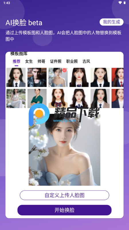 AIface是一款功能强大的AI换脸软件,它通过人工智能技术为用户提供便捷的换脸体验。打开软件后,用户会发现各种短视频模板,如古风汉服、女神降临、时尚街拍、旗袍佳人以及男士专属等,这些模板风格多样,满足不同用户的个性化需求。