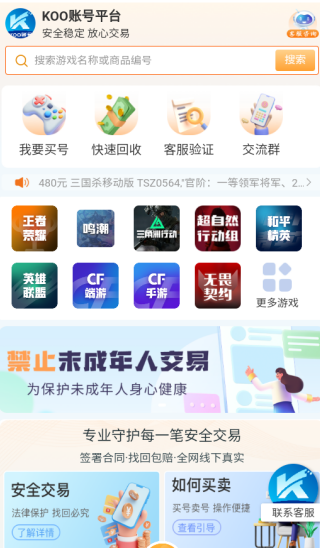 Koo账号是一款专注于游戏账号交易的专业平台,提供《王者荣耀》《和平精英》《蛋仔派对》等热门游戏的账号、道具及皮肤交易服务,为用户提供专业的售后保障,保证用户权益,有需要的用户不妨下载一个吧。