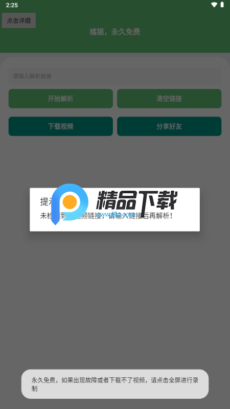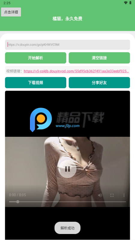 橘猫视频去水印是一款操作便捷的一键去水印软件,其解析速度快,能高效去除大部分短视频平台的水印。软件界面简洁,无广告干扰,为用户提供清爽的使用体验。不过,部分视频不支持直接下载,需点击链接在浏览器中完成下载。需要去水印下载其他人视频的可以下载