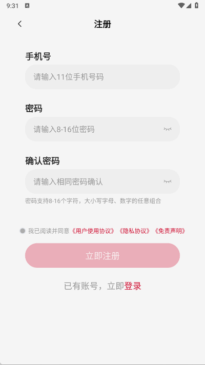 4、若是没有账号可以先注册账号,如图所示,点击【注册】按钮,进入到注册界面,然后输入手机号,密码,确认密码,最后点击底部的【立即注册】完成。