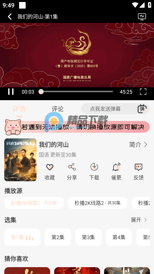 1、打开正在播放的剧集,中间有个播放源。