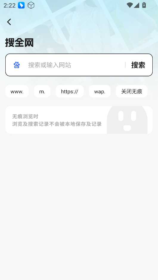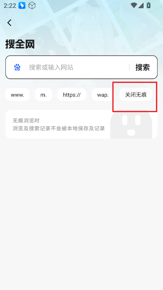 4、返回首页点击搜索栏则会提示正在无痕浏览。