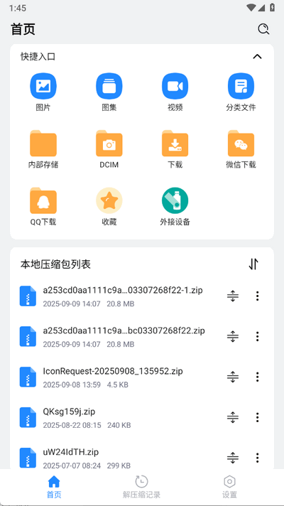 2、双向操作便捷性:既支持单个或批量文件/文件夹的压缩(含加密选项),也能快速解压已存在的压缩包,并提供历史记录查看功能以便追溯操作轨迹。