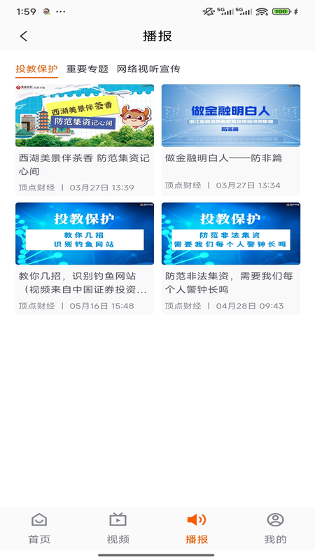 4、点击首页下方工具栏的播报,有具体的分类,你可以选择想看的内容查看。
