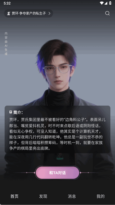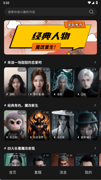 登录后点击“发现”板块,浏览推荐的AI角色(如栗淮云、张叶溪),或通过“自定义”功能创建专属角色;