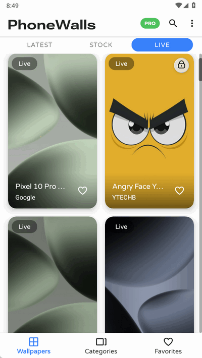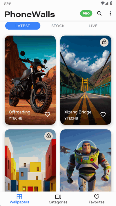 1、智能分类浏览:设有30多个类别(如自然、动漫、极简主义),方便用户根据喜好筛选;同时支持收藏夹功能保存心仪的壁纸。