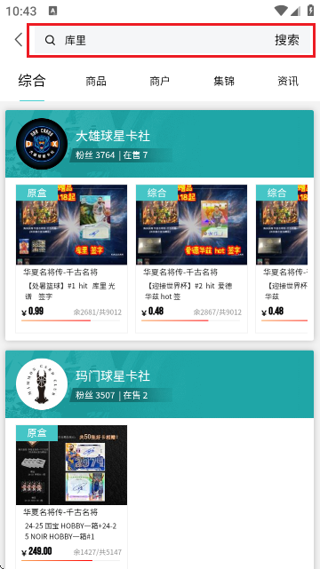 5、其中的搜索功能更是可以帮助用户更加精准快速的找到自己喜欢的球队、球员、卡种、商户。例如【库里】