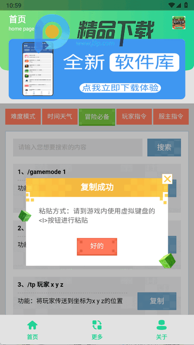 1、指令生成与编辑:支持以填空方式快速完成命令编辑,提供辅助输入、补全及错误检查功能。输入正确指令时会出现相关提示,降低操作门槛。用户还可通过悬浮窗在游戏过程中实时复制、粘贴或修改指令,提升效率。