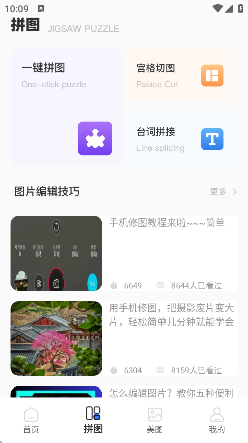 2、接着点击下方的“拼图”,找到“一键拼图”。